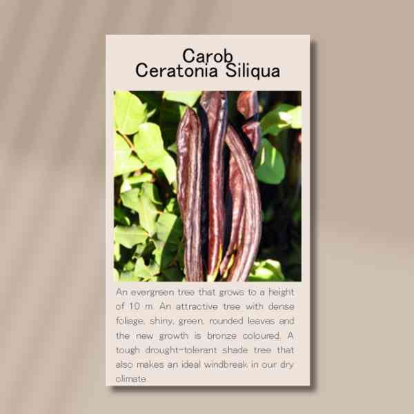 Carob is an evergreen tree that grows to a height of 10 m, best grown in temperate regions of Australia. An attractive tree with dense foliage, shiny, green, rounded leaves and the new growth is bronze coloured. They are often used as street trees and are good in an orchard situation. They are a tough drought-tolerant shade tree that also makes an ideal windbreak in our dry climate.