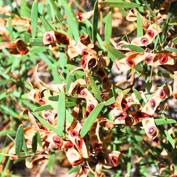 From around October through to January, long, flat seed pods develop and gradually mature. As they dry, they begin to twist and curl, eventually splitting open to reveal the seeds inside. These seeds are quite distinctive, each one marked by a vivid red aril, or stalk, that gives the plant its common name.