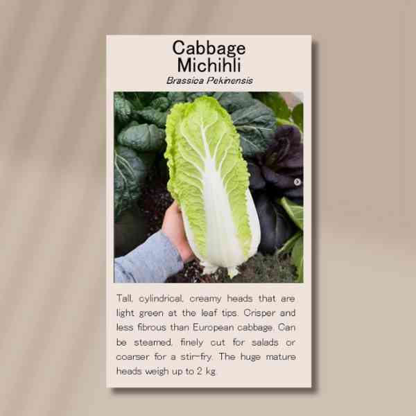 Cabbage Michihili is an heirloom Chinese variety with a long history of use, valued for both its looks and its eating quality. At first glance it does not resemble the round, tightly wrapped European cabbages many of us grew up with. Instead, it forms tall, cylindrical heads that stand upright in the patch, creamy white at the base and shading through pale green to deeper green at the tips, rather like an oversized romaine lettuce.