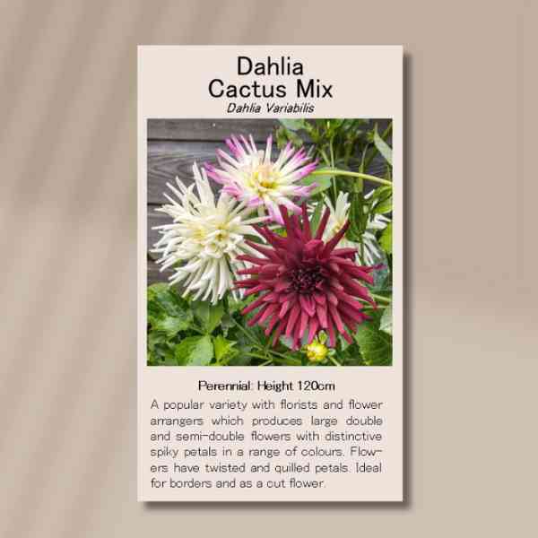 Dahlia Cactus Flower Mix brings together the dramatic form and bold presence that cactus dahlias are known for. Each bloom is made up of long, narrow petals that are rolled, quilled, or twisted along their length, tapering to pointed tips. This creates a spiky, starburst effect that sets cactus dahlias apart from the rounder, softer forms or pompon types.