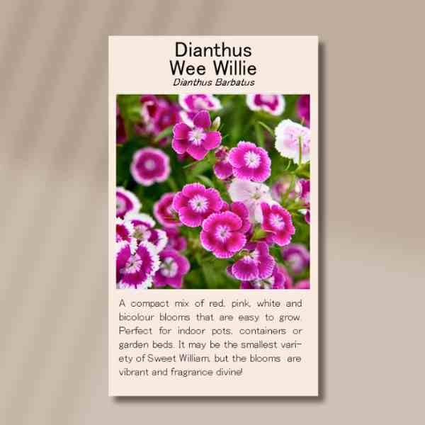 Although Wee Willie is the smallest of the Sweet Williams, it has a knack for standing out. Each bloom, despite its size, has depth and personality. Some flowers appear with delicately edged petals, while others show off bold rings of colour. Up close, the petals often reveal fine details and patterns, a little reminder of the artistry in nature. The plants grow into neat, rounded mounds that make them perfect for edging, pots, or the front of a sunny border. They also look beautiful tumbling from window boxes or mixed containers, adding a playful burst of colour wherever they are grown. The flowers carry a soft, clove-like scent that is warm and sweet, especially noticeable in the early morning or late afternoon when the sun is low. Itโ€™s subtle rather than overpowering, and it blends beautifully with other scented plants like lavender or alyssum.