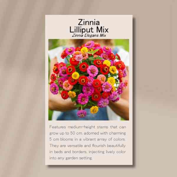 Zinnia Lilliput features medium-height stems that can grow up to 50 cm, adorned with charming 5 cm blooms in a vibrant array of colors.